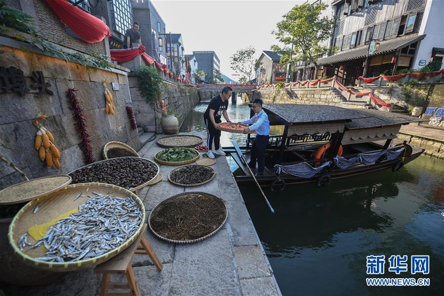 9月30日,工作人员在瓶窑老街摆放农作物。新华社记者 徐昱 摄