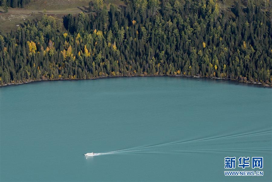 在新疆阿勒泰地区喀纳斯景区,一艘游艇从湖面驶过(9月17日摄)。 新疆文旅产业在做好疫情防控常态化的前提下开始全面恢复,旅游市场呈快速升温态势。 新华社记者 丁磊 摄