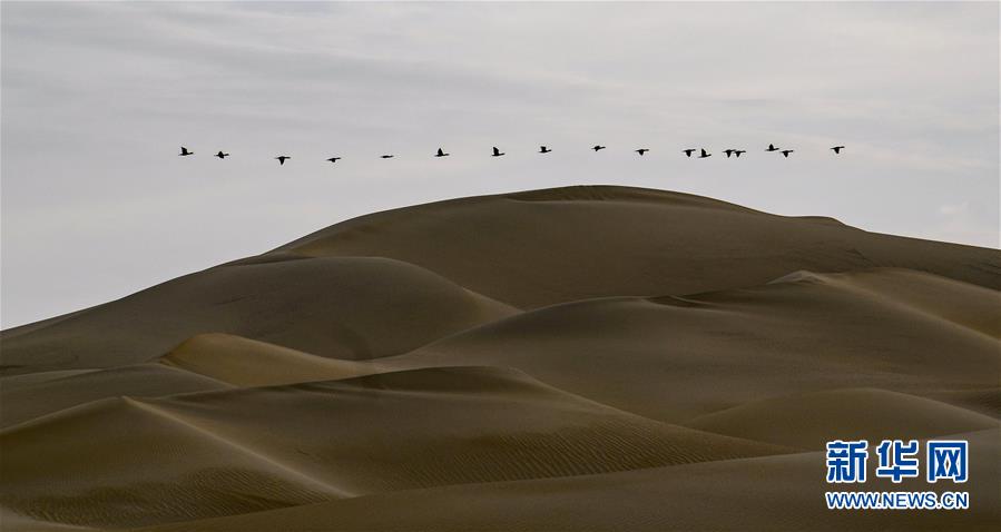 一群飞鸟从塔克拉玛干沙漠边缘罗布湖旁的沙丘上飞过(9月15日摄)。 新疆文旅产业在做好疫情防控常态化的前提下开始全面恢复,旅游市场呈快速升温态势。 新华社记者 赵戈 摄