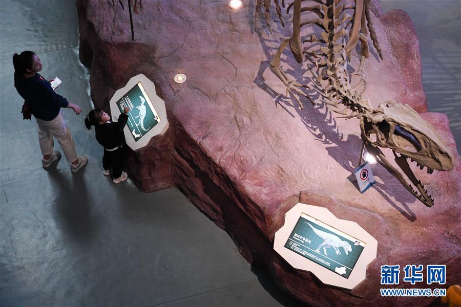 10月3日,家长带着孩子在安徽省地质博物馆恐龙厅参观。 当日是国庆假期第三天,不少市民和游客前往位于合肥的安徽省地质博物馆参观。 新华社记者 张端 摄