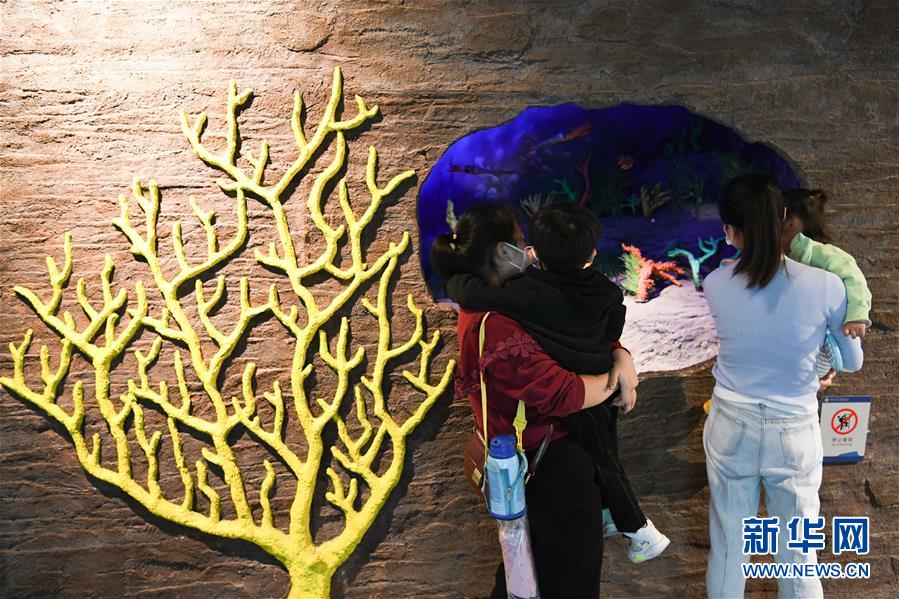 10月3日,家长带着孩子在安徽省地质博物馆生命演化厅参观。 当日是国庆假期第三天,不少市民和游客前往位于合肥的安徽省地质博物馆参观。 新华社记者 张端 摄