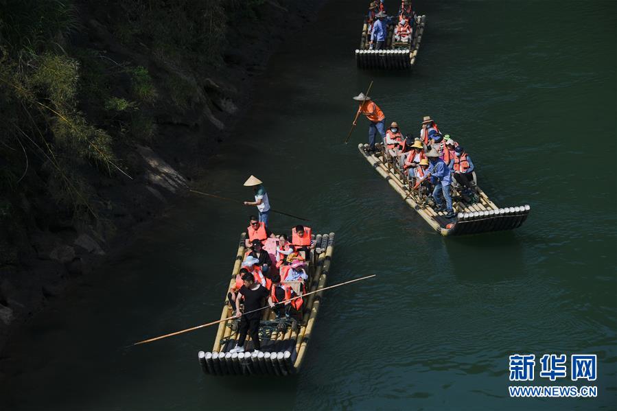 10月4日,游客在福建省武夷山风景名胜区九曲溪乘坐竹筏。 长假期间,世界文化与自然双重遗产福建武夷山景区客流显著回升,10月1日至4日景区接待超过11万人次,旅游市场呈现繁荣有序的景象。 新华社记者 宋为伟 摄