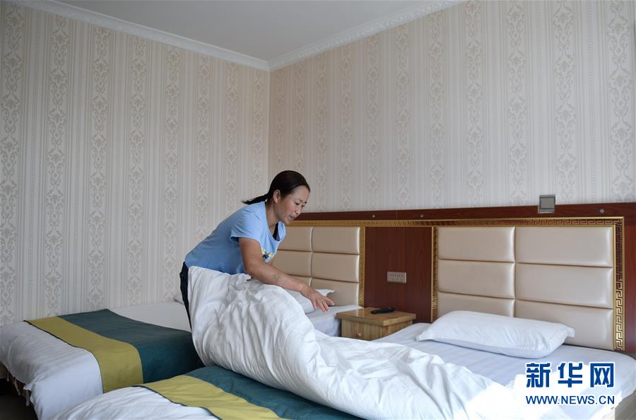 9月22日,在青海省海西蒙古族藏族自治州乌兰县茶卡镇巴音村,当地村民申得屏在自家经营的家庭宾馆内整理床铺。 新华社记者 张龙 摄
