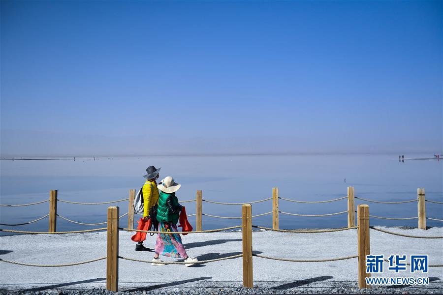 9月23日,游客在茶卡盐湖“天空之镜”景区游玩。 新华社记者 张龙 摄