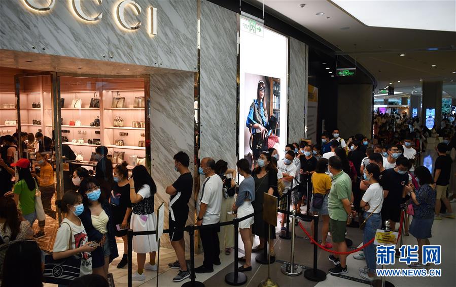 10月5日,游客在三亚国际免税城排队购物。 中秋和国庆长假期间,海南离岛免税购物火爆。 新华社记者 郭程 摄