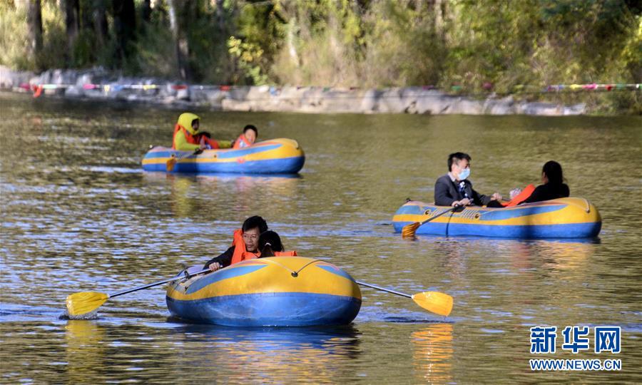 10月6日,游客在延庆区千家店镇的白河上参加休闲漂流活动。 国庆中秋长假期间,众多游客来到位于燕山脚下的北京市延庆区,参观游览百里山水画廊、世园公园、野鸭湖湿地保护区、龙庆峡、四季花海等景区,尽情体会当地自然美景和风土人情。 新华社记者 李欣 摄