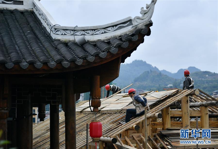 10月9日,在湖北省宣恩县城区,工人在采用传统方法建造吊脚楼。