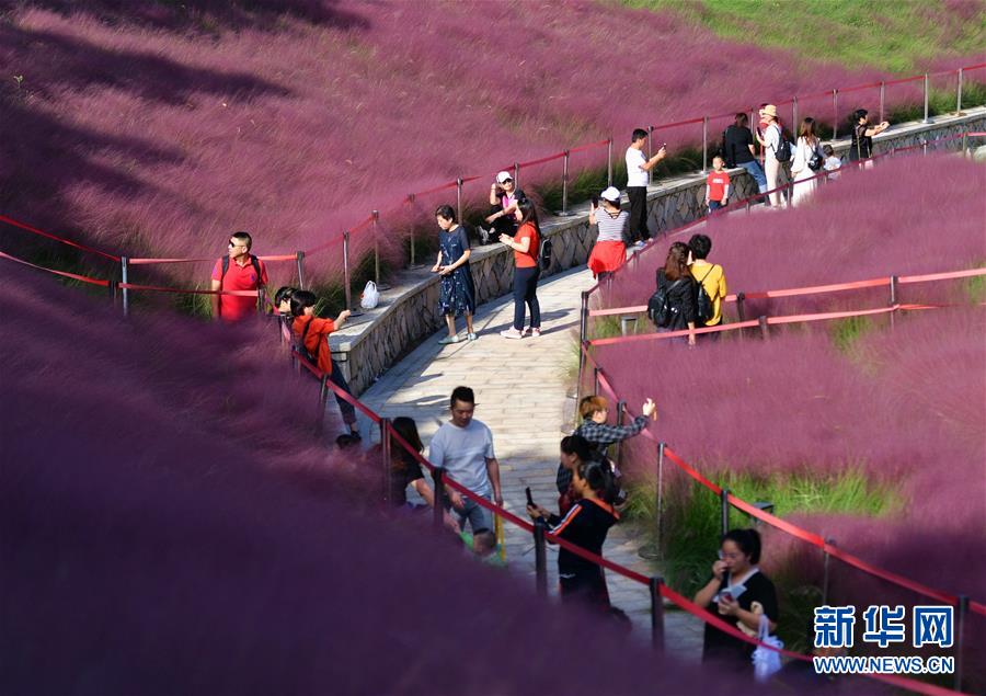 金秋时节,福建省福州市牛岗山公园和鹤林生态公园里的粉黛乱子草进入观赏季,成片的“粉色海洋”如梦幻花海,吸引游客和摄影爱好者前来观赏拍摄。
