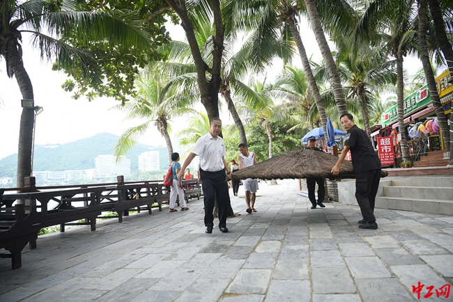 2020年10月13日,海南三亚,工作人员在大东海景区撤离相关设施。