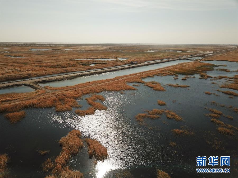 这是10月14日在甘肃省武威市民勤县拍摄的青土湖秋色(无人机照片)。 又到一年金秋时,在拥有“中国沙乡”之称的甘肃省武威市民勤县,胡杨、红柳等沙生植物尽染秋色,美不胜收。 新华社记者 郭刚 摄