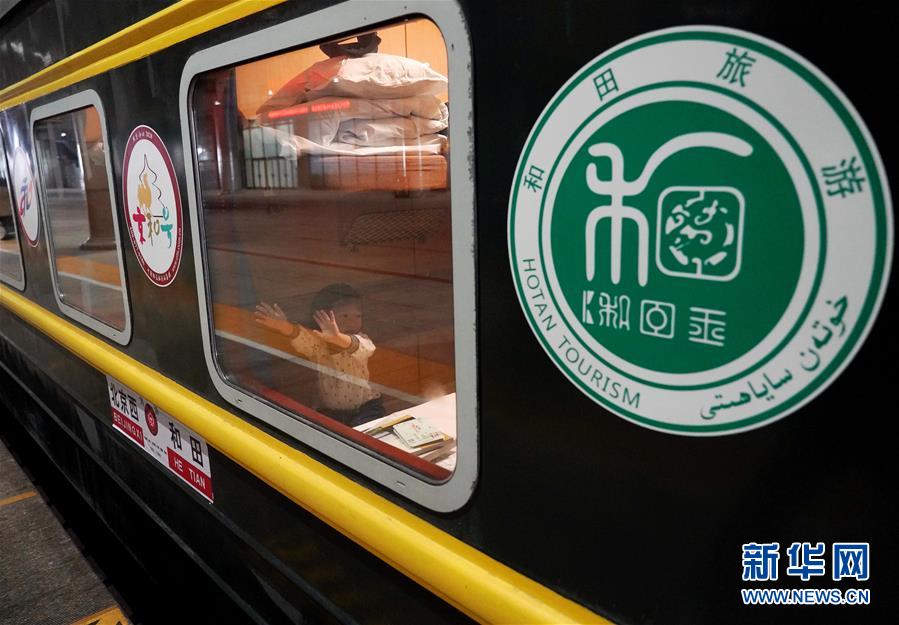 10月15日,一名小朋友在“京和号”旅游专列上等候发车。 当日,2020年首趟“京和号”旅游专列开行,500名旅客乘坐专列从北京西站出发,踏上畅游大美新疆之旅。 新华社记者 张晨霖 摄