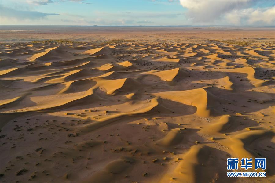 巴丹吉林沙漠风光(10月15日摄,无人机照片)。 巴丹吉林沙漠位于内蒙古阿拉善高原中心,高大的沙丘在秋日的映衬下焕发出金色的光泽,美不胜收。 新华社记者 连振 摄