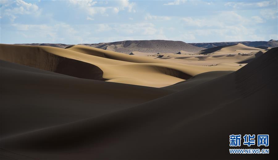 巴丹吉林沙漠风光(10月15日摄)。 巴丹吉林沙漠位于内蒙古阿拉善高原中心,高大的沙丘在秋日的映衬下焕发出金色的光泽,美不胜收。 新华社记者 连振 摄