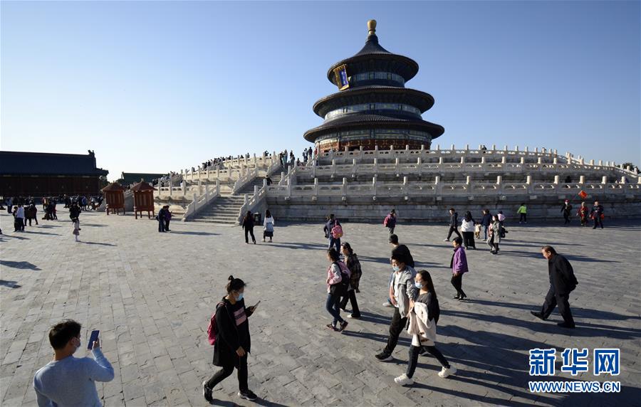 10月17日,游人在天坛祈年殿游览。 当日,北京天气晴好,天坛公园迎来各地的游人入园参观游览。 新华社记者李欣摄