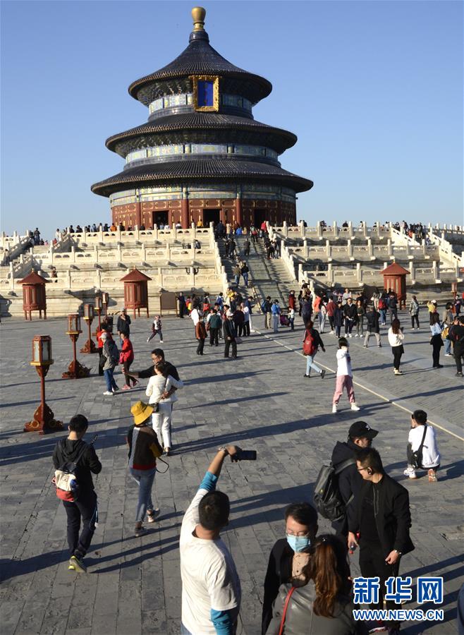 10月17日,游人在天坛祈年殿游览。 当日,北京天气晴好,天坛公园迎来各地的游人入园参观游览。 新华社记者李欣摄