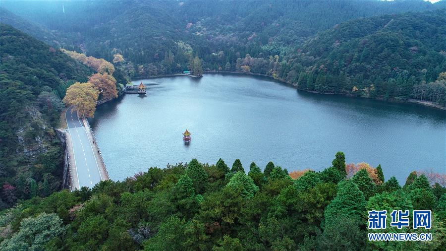 这是10月17日在庐山风景区拍摄的芦林湖(无人机照片)。 近日,位于江西省九江市的庐山风景区云雾缭绕,层林尽染,许多游客前来赏秋。 新华社记者 胡晨欢 摄
