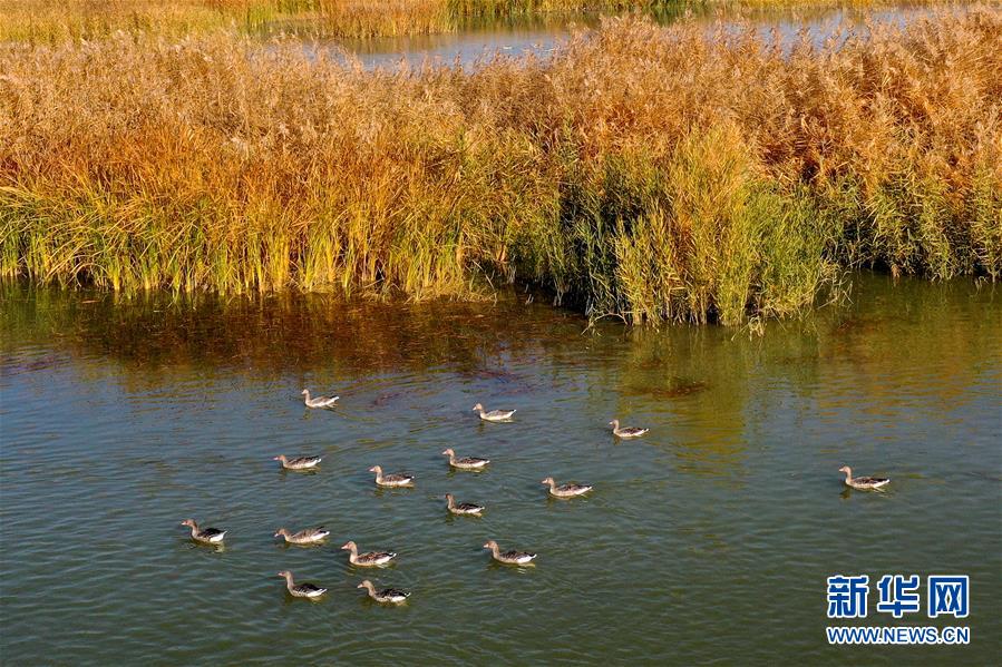 10月18日,在玛纳斯国家湿地公园,一群灰雁在水中休憩(无人机照片)。 近日,位于新疆昌吉回族自治州玛纳斯县的玛纳斯国家湿地公园景色迷人。玛纳斯湿地是候鸟的重要栖息地和繁殖地。每年秋季,数万只候鸟在此停留歇息,点缀湿地画卷。 新华社记者 丁磊 摄