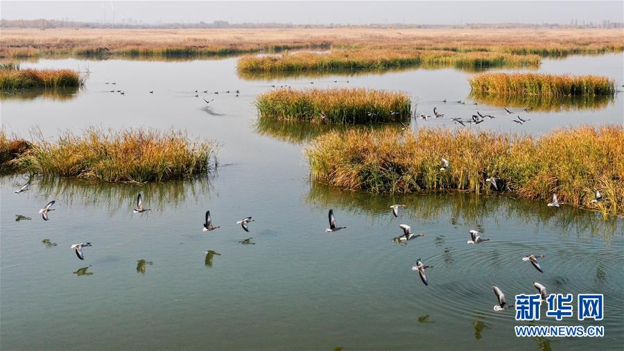 10月18日,一群候鸟在玛纳斯国家湿地公园栖息(无人机照片)。 近日,位于新疆昌吉回族自治州玛纳斯县的玛纳斯国家湿地公园景色迷人。玛纳斯湿地是候鸟的重要栖息地和繁殖地。每年秋季,数万只候鸟在此停留歇息,点缀湿地画卷。 新华社记者 丁磊 摄