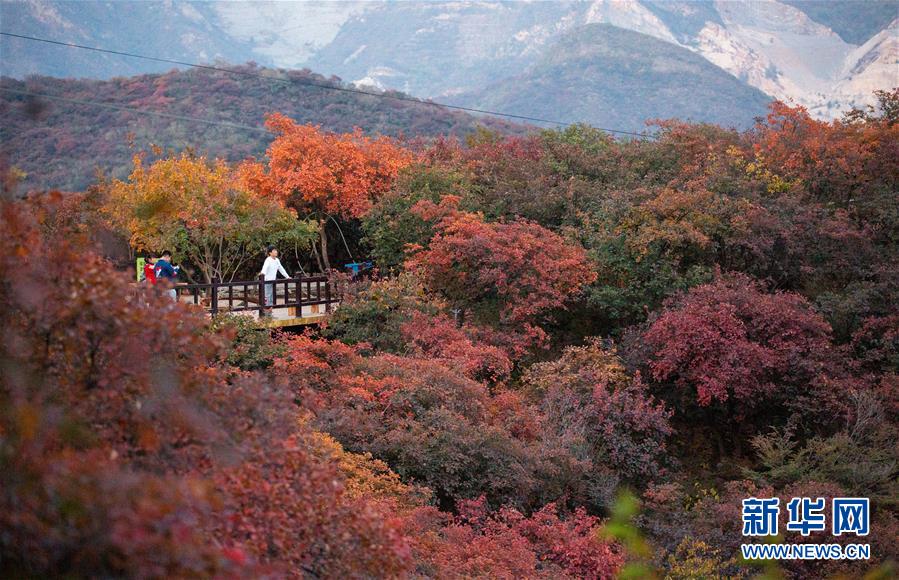 10月18日,游客在北京市房山区坡峰岭景区观赏红叶。 金秋十月,又到了北京观赏红叶的最佳时节。坡峰岭景区位于北京市房山区,总面积约2000亩,景区内有元宝枫、黄栌、火炬等多个红叶品种,漫山的红叶吸引游客前来观赏。 新华社记者 吕帅 摄