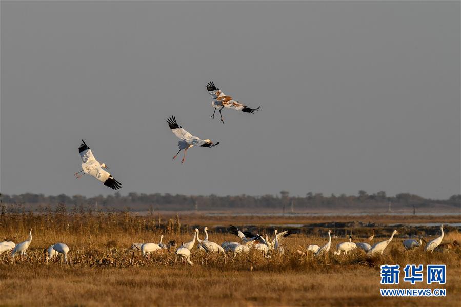 10月19日,在位于吉林省白城市镇赉县的莫莫格国家级自然保护区,几只白鹤从湿地上空飞过。 近日,在吉林省白城市镇赉县,近千只白鹤来到莫莫格国家级自然保护区停歇。白鹤部分种群繁殖于西伯利亚地区,在中国鄱阳湖越冬,莫莫格湿地是它们每年秋季南迁的重要停歇地。 新华社记者 张楠 摄