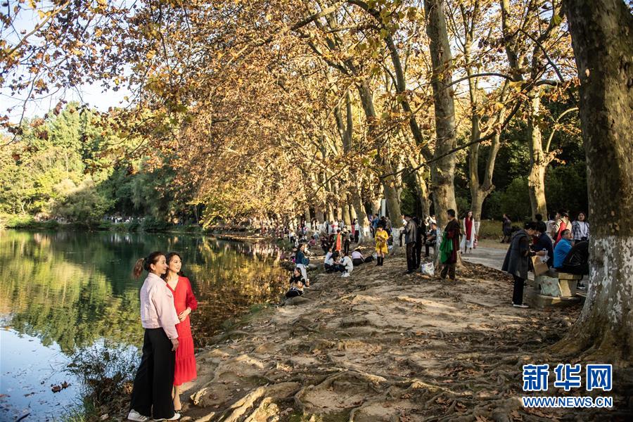 10月25日,游客在贵阳市花溪国家城市湿地公园黄金大道游玩、拍照留念。 深秋时分,贵州省贵阳市花溪国家城市湿地公园黄金大道秋意盎然,吸引众多游客前来观赏游玩。 新华社记者 陶亮 摄