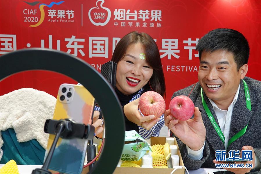 10月27日,苹果经销商在2020年中国·山东国际苹果节上通过网络直播的形式推介苹果。 当日,为期3天的2020年中国·山东国际苹果节在山东省烟台市国际博览中心开幕。本次大会以“创新、提质、增效、富民”为主题,来自国内外主要苹果产区及优质果品地区的20余家展团及300余家涉农企业参会参展。 新华社发(唐克 摄)