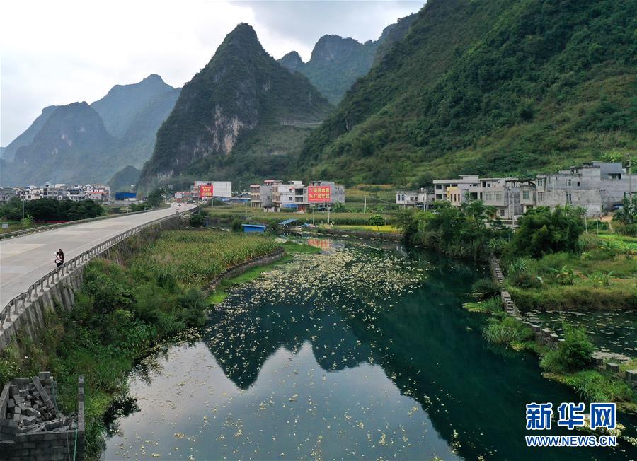 这是广西都安瑶族自治县大兴镇境内澄江河景色(10月28日摄,无人机照片)。 时下,广西都安瑶族自治县澄江河上开满了海菜花,形成一道独特的生态景观。海菜花对生存环境的水质要求高,被视为“水质风向标”。 新华社记者 陆波岸 摄