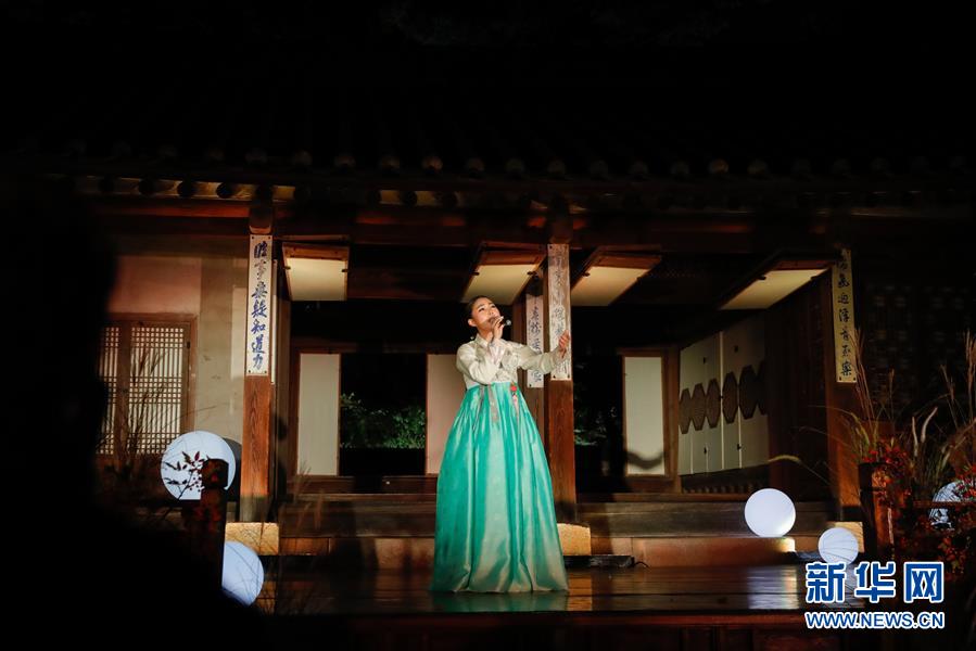 10月29日,演员在韩国首尔昌德宫后苑内为参观者表演传统演出。 昌德宫位于韩国首都首尔市钟路区,是韩国著名历史文化景点,以其幽美的景观著称,于1997年被联合国教科文组织列为世界文化遗产。 新华社记者 王婧嫱 摄