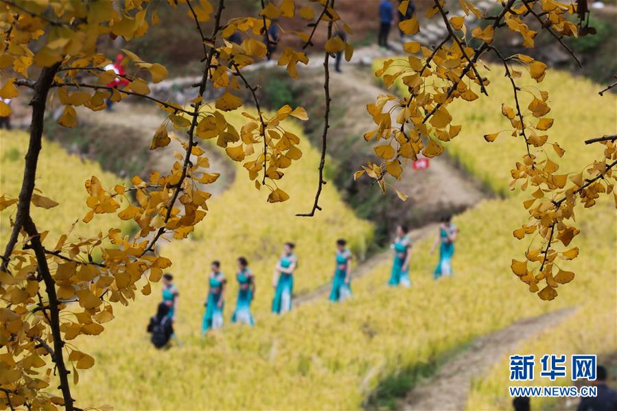 11月1日拍摄的指南村的金黄稻田和银杏树。 11月1日,“指南红叶节”活动在浙江省杭州市临安区太湖源镇指南村举行。本次金秋红叶节将举行观赏金秋红叶梯田、梯田稻谷收割、古戏台银杏音乐会、山顶星空露营帐篷节等系列主题活动。 指南村海拔近600米,森林覆盖率达93%以上。每到深秋,村落周边的千亩梯田、金黄的银杏和火红的枫树将指南村装扮得美如画卷。 新华社记者 徐昱 摄
