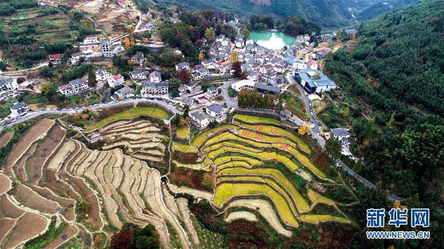11月1日空中俯瞰指南村(无人机照片)。 11月1日,“指南红叶节”活动在浙江省杭州市临安区太湖源镇指南村举行。本次金秋红叶节将举行观赏金秋红叶梯田、梯田稻谷收割、古戏台银杏音乐会、山顶星空露营帐篷节等系列主题活动。 指南村海拔近600米,森林覆盖率达93%以上。每到深秋,村落周边的千亩梯田、金黄的银杏和火红的枫树将指南村装扮得美如画卷。 新华社记者 徐昱 摄