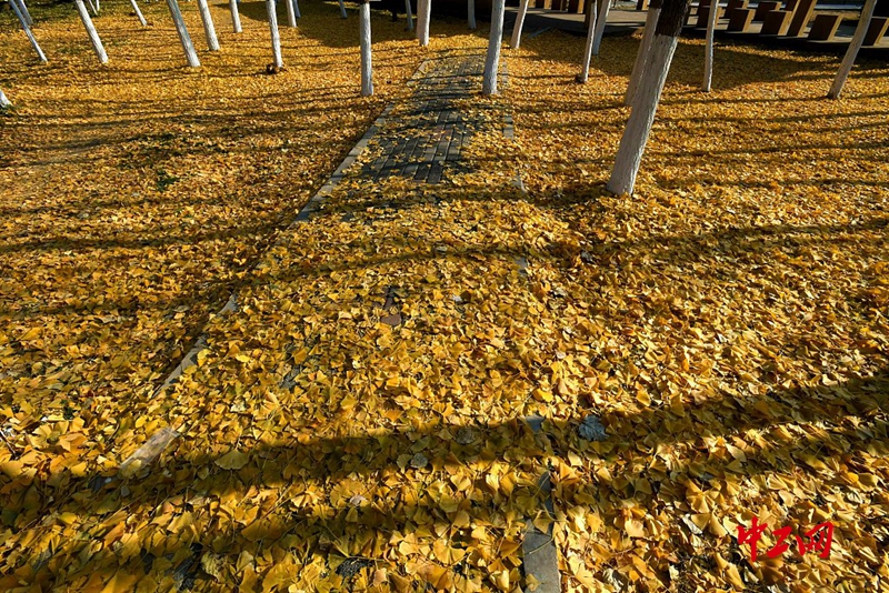 2020年11月4日,沈阳秋叶满地,一片金色美不胜收,引得很多市民来到公园与银杏林间拍照漫步。大风天气后,秋叶掉落,路上好似铺上了厚厚的地毯。