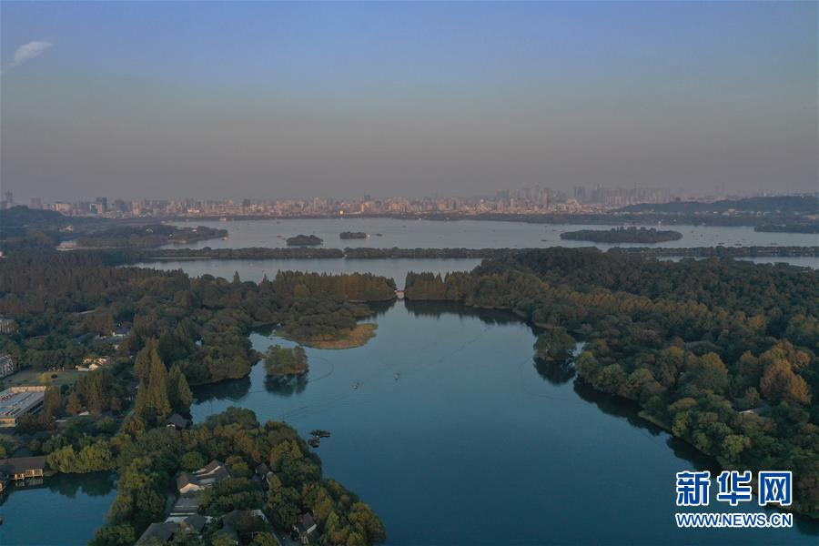 这是11月6日无人机拍摄的杭州西湖景区茅家埠附近的景色。 时值深秋,夕阳下的杭州西湖景区风景迷人,五彩斑斓的自然景观与城市建筑群隔湖相望。 新华社记者 黄宗治 摄