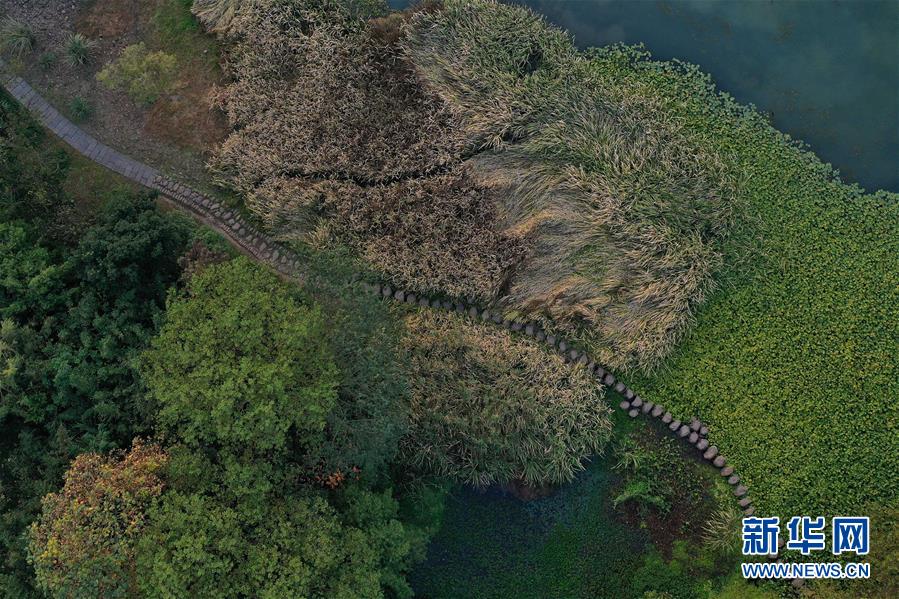 这是11月6日无人机拍摄的杭州西湖景区茅家埠的临湖步道。 时值深秋,夕阳下的杭州西湖景区风景迷人,五彩斑斓的自然景观与城市建筑群隔湖相望。 新华社记者 黄宗治 摄