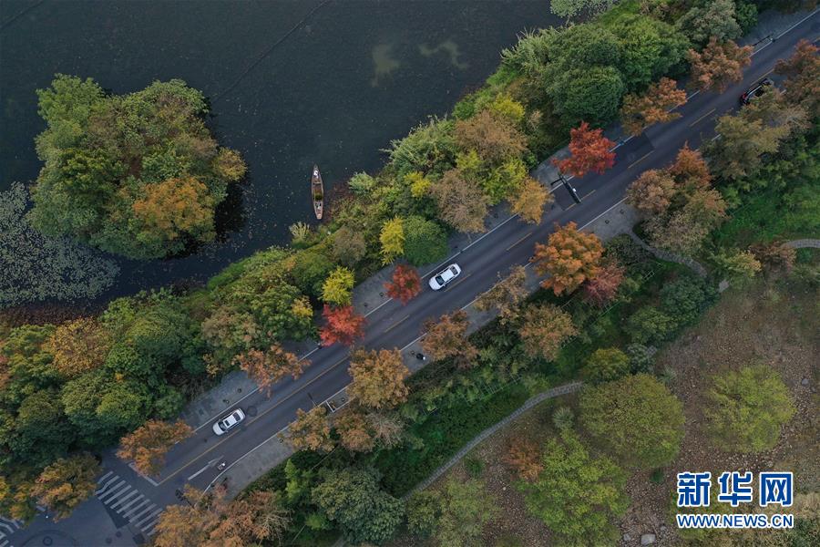 11月6日,汽车行驶在杭州西湖景区(无人机照片)。 时值深秋,夕阳下的杭州西湖景区风景迷人,五彩斑斓的自然景观与城市建筑群隔湖相望。 新华社记者 黄宗治 摄