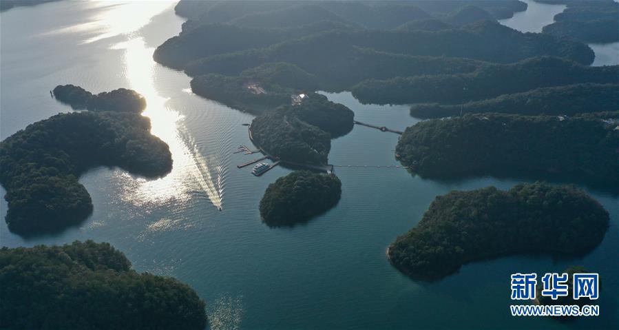 这是11月7日拍摄的庐山西海(无人机照片)。 当日是立冬节气,江西庐山西海在阳光下波光粼粼,美不胜收。 新华社记者 周密 摄