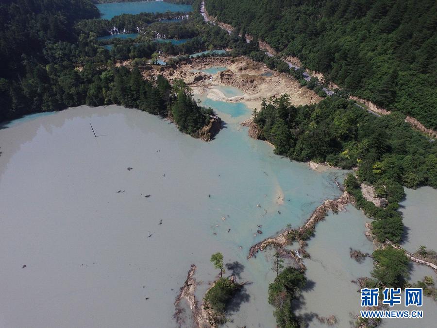 这是2017年九寨沟遭遇地震后的火花海景点(2017年8月9日摄,无人机照片)。