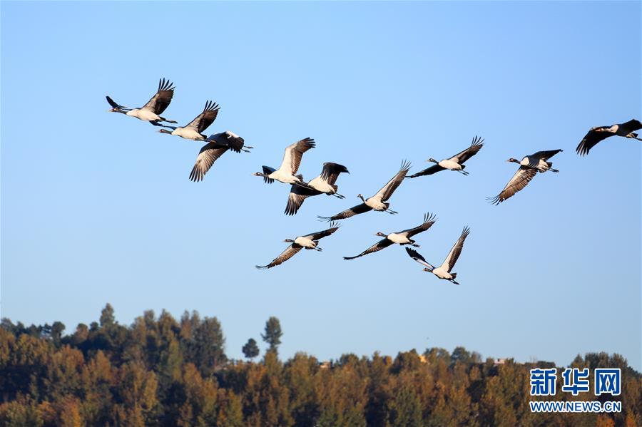 11月16日,黑颈鹤在贵州草海国家级自然保护区飞翔。 连日来,位于贵州省毕节市威宁彝族回族苗族自治县的草海国家级自然保护区陆续迎来黑颈鹤等越冬候鸟。 新华社发(何欢 摄)