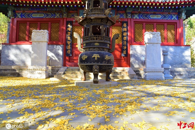 2020年11月12日,北京,昌平,南口镇,花塔村和平寺有两株 银杏树一雌一雄,相守千年,如今枝繁叶茂正值秋末冬初金雨纷飞,黄金满地,大美古刹遍地黄,千年银杏放光芒。qianlong/IC photo