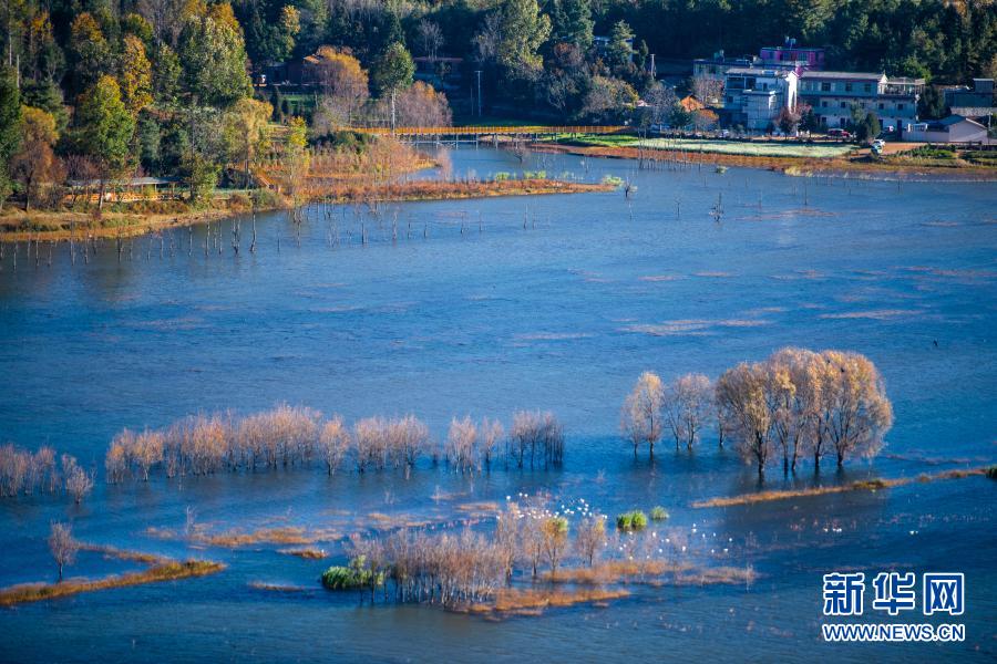 念湖位于云南省曲靖市会泽县境内,海拔约2500米。冬日里,念湖清澈透亮的湖水与水草、树木、山峦、村庄形成一幅美丽的画卷。新华社记者 胡超 摄