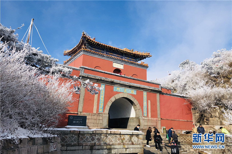 泰山红色的砖瓦配上白色的雪花,分外妖娆。新华网发(李春妍 摄)