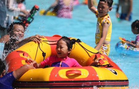 北京:民众戏水消暑,乐享暑期时光。8月10日,小朋友在北京燕子湖水乐园戏水冲浪,乐享暑期时光。