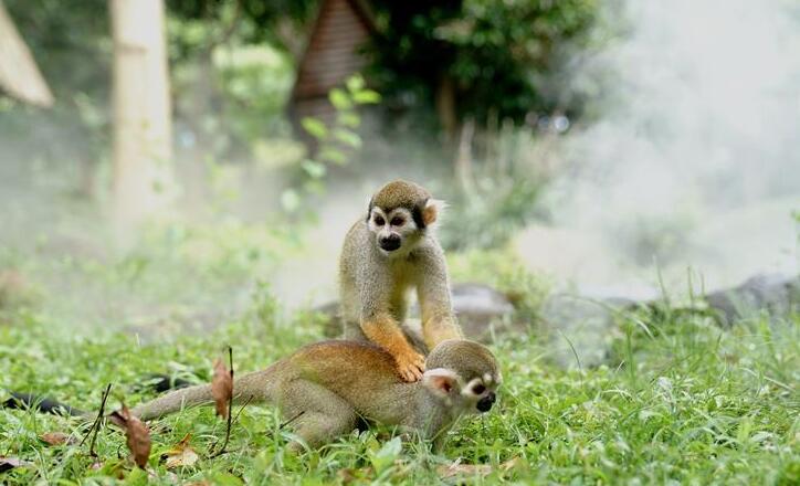 8月11日,上海动物园的松鼠猴在“地喷”营造的水雾中玩耍。 当日,上海最高温度达到35摄氏度,上海动物园开启园内安装的各种喷淋装置,让动物们防暑降温,乐享清凉。
