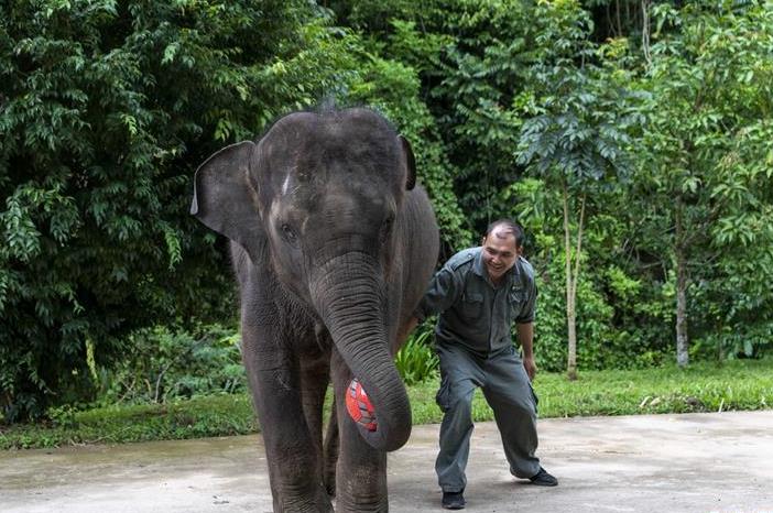 8月12日,在西双版纳傣族自治州亚洲象种源繁育及救助中心,救助象“羊妞”在生日会上与一名“象爸爸”玩皮球。当日是世界大象日。