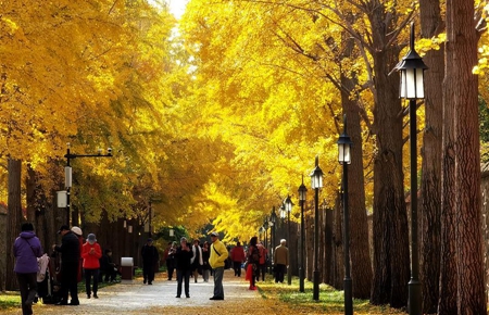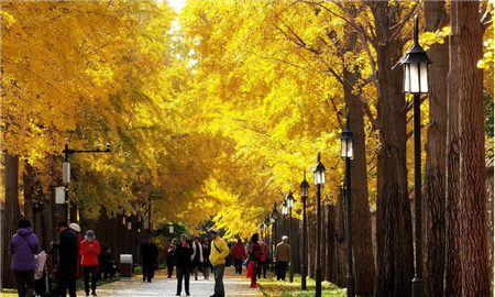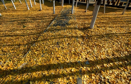 2020年11月4日,沈阳秋叶满地,一片金色美不胜收,引得很多市民来到公园与银杏林间拍照漫步。