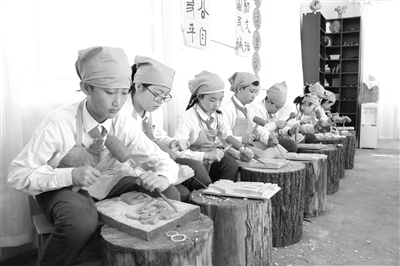 学生在木刻室上劳动技能训练课。 本文作者 供图