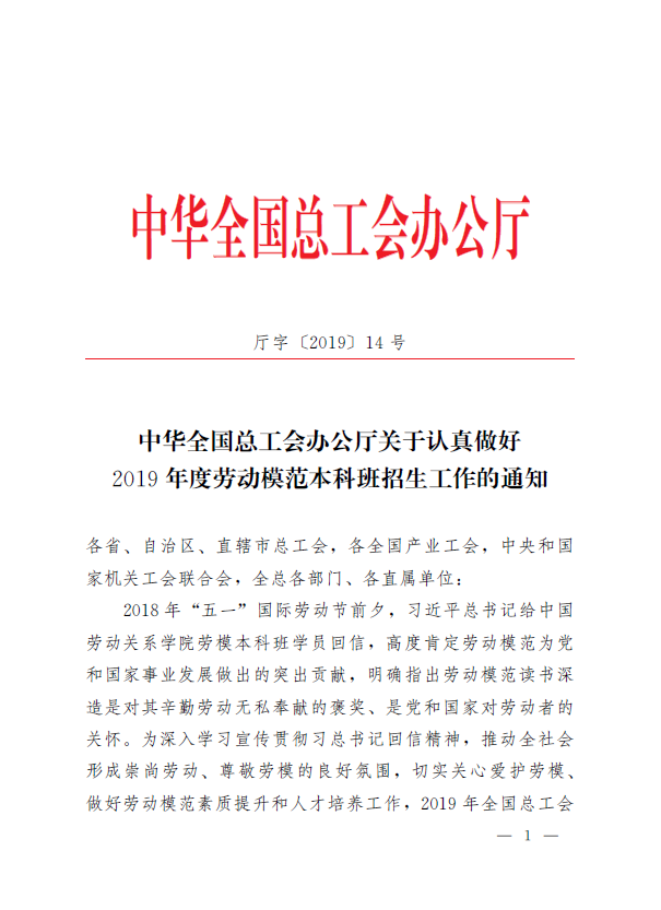2018年“五一”国际劳动节前夕,习近平总书记给中国劳动关系学院劳模本科班学员回信,高度肯定劳动模范为党和国家事业发展做出的突出贡献,明确指出劳动模范读书深造是对其辛勤劳动无私奉献的褒奖、是党和国家对劳动者的关怀。为深入学习宣传贯彻习总书记回信精神,推动全社会 形成崇尚劳动、尊敬劳模的良好氛围,切实关心爱护劳模、做好劳动模范素质提升和人才培养工作,2019年全国总工会决定由中国劳动关系学院继续举办成人高等教育劳动模范本科班。现就做好2019年度中国劳动关系学院劳模本科班招生工作通知如下。