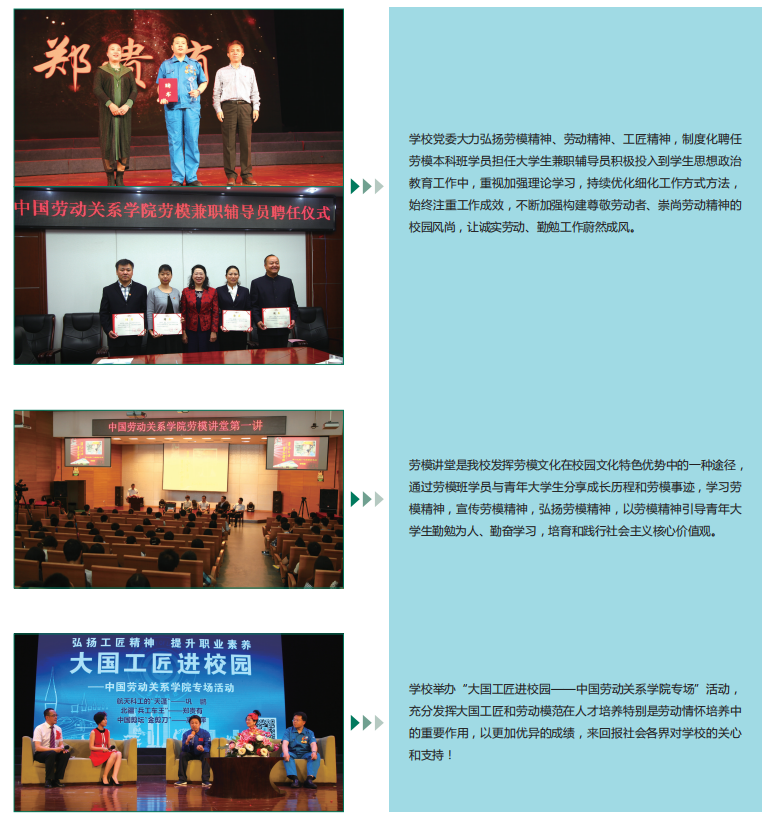 在扎实办好劳模本科教育的同时,学校立足行业特色和学校实际,积极构建特色校园文化,加强劳动教育,培育师生深厚劳动情怀。着力发挥“劳动模范在校园、大国工匠在身边”、劳动关系和工会领域学科体系较为完整的优势,坚持举办“劳模大讲堂”“大国工匠面对面” “劳模党支部与学生党支部共建”等活动,大力弘扬劳模精神和工匠精神,让大学生有机会近距离接触劳动模范、感受劳模精神、聆听劳模故事、观摩精湛匠艺、分享工匠情怀,引导青年师生学习劳动模范和大国工匠勤奋学习、勤于钻研、勤勉敬业的精神,自觉践行社会主义核心价值观,取得了显著成效。