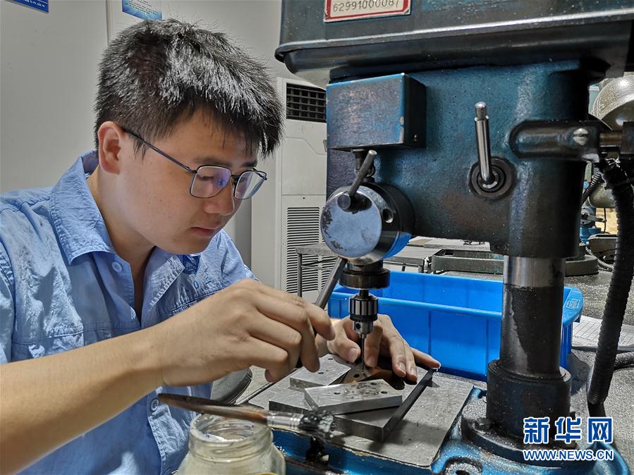 在上海航天技术研究院某下属研究所钳工车间,邱仙发在钻床上完成某型号零件的钻孔加工(8月13日摄)。 新华社发(上海航天技术研究院供图)