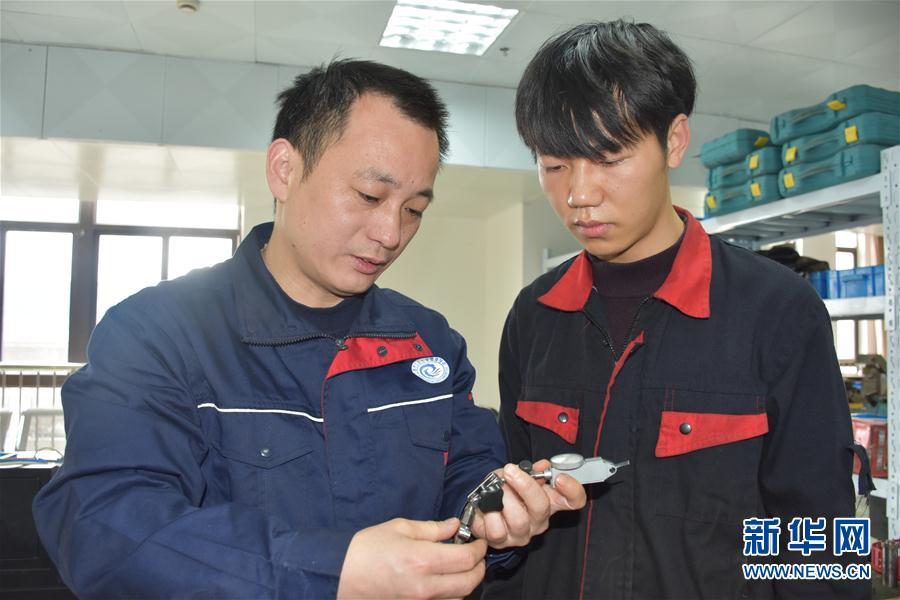 上海市工程技术管理学校钳工高级教师汤勇杲(左)在对“航天订单班”学生进行专用测量工具使用方法教学 (2019年3月11日)。 新华社发(上海市工程技术管理学校供图)