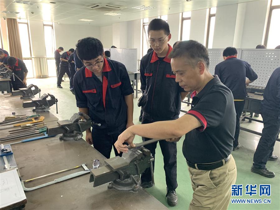 上海航天技术研究院某下属研究所高级工程师陆伟亮(右一)在上海市工程技术管理学校实训室讲授专业课(2019年6月12日摄)。 新华社发(上海市工程技术管理学校供图)